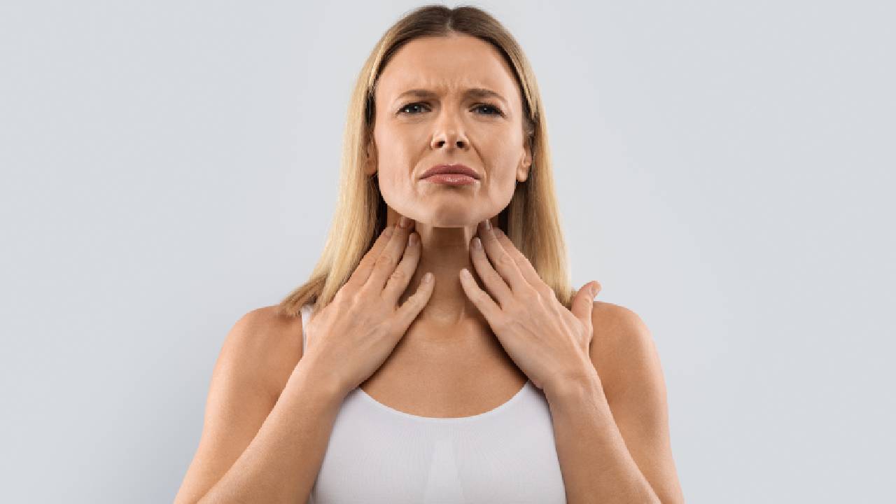 - Πρήξιμο στο μπροστινό μέρος του λαιμού, ακριβώς κάτω από το μήλο του Αδάμ